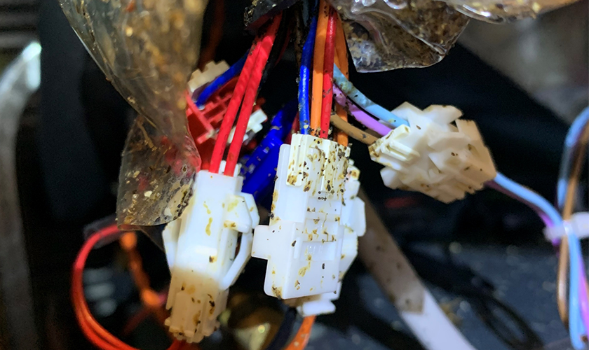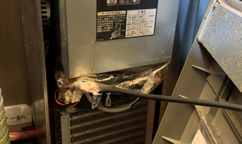 配線に付着している黒い点はゴキブリの糞です。このようにして発生源を特定します。