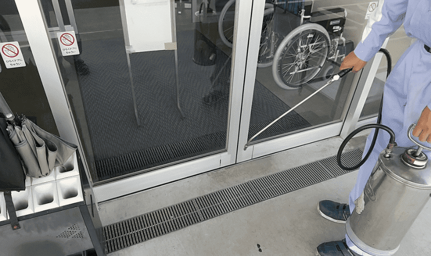 ポンプを使った残効性薬剤の散布。