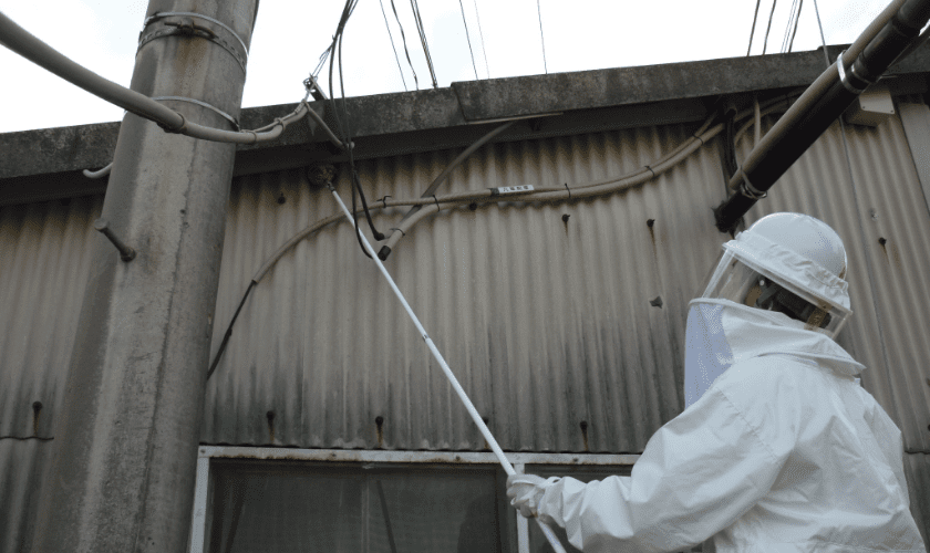 駆除作業は、ハチ専用の防護服を着用して行います。また、ハチが巣に戻る日没後に極力作業します(やむを得ず昼間に作業する場合は、巣の撤去後も20~30分待ち、戻りバチを駆除します)。