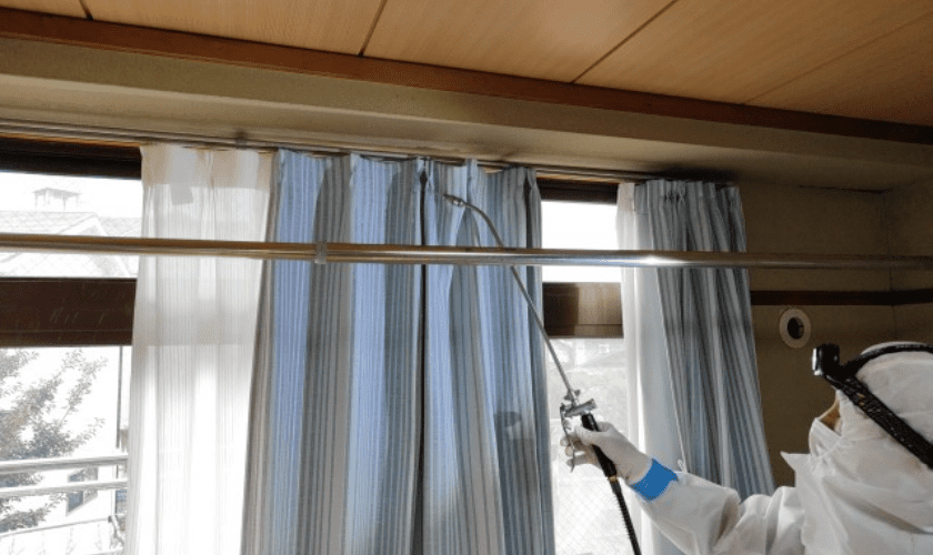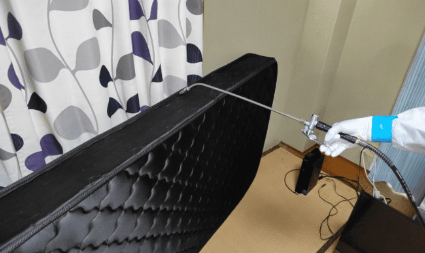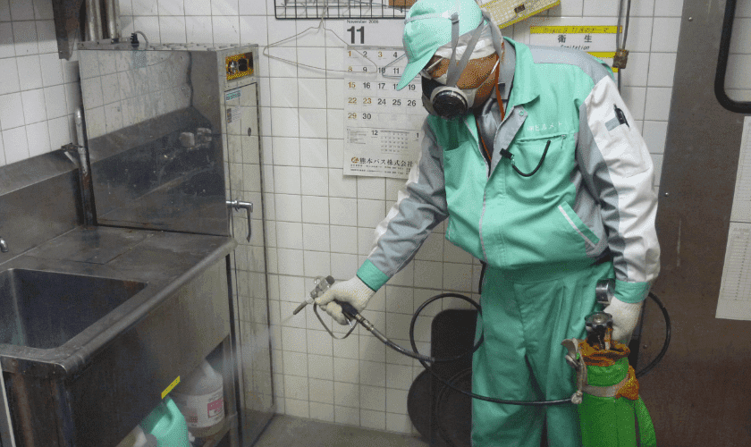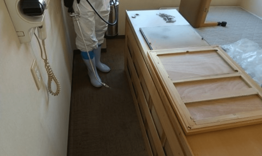 潜伏場所をある程度調べたら、徹底的に薬剤を噴霧します。トコジラミはわずかな隙間に潜んでいるため、生きた個体をすべて見つけて直接薬剤を噴霧することはできません。そこで、残効性の高い薬剤を広範囲に噴霧しておき、トコジラミが徘徊する際に薬剤に接触させて殺虫するという考え方で処理をします。