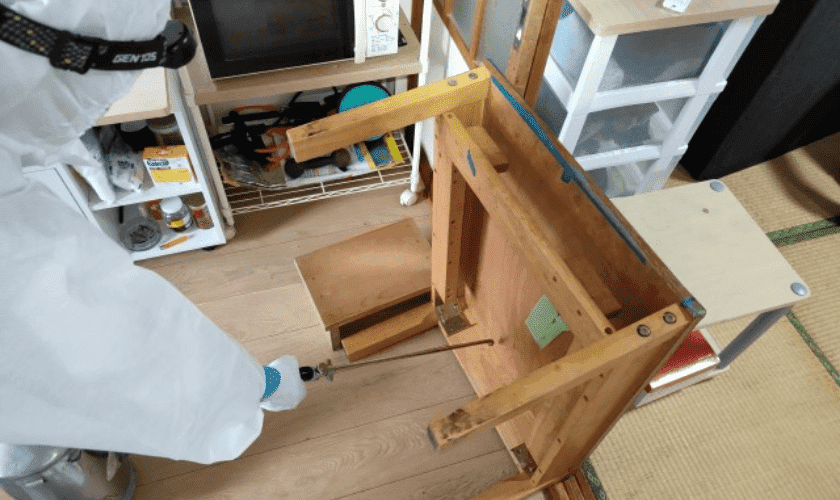 木部はトコジラミが好む箇所です。椅子も隅々まで薬剤噴霧します。